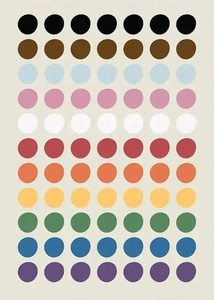 Les rangées de cercles créent un motif régulier, presque méditatif. Les couleurs se succèdent en bandes horizontales : teintes sombres, tons bruns, pastels, neutres, rouges, oranges, jaunes, verts, bleus puis violets. Le tout se détache sur un fond beige clair, donnant un rendu équilibré et lisible. Le charme du visuel tient dans sa simplicité : aucun texte, aucun symbole figuratif — uniquement des couleurs disposées avec soin, pour un effet décoratif expressif et universel.