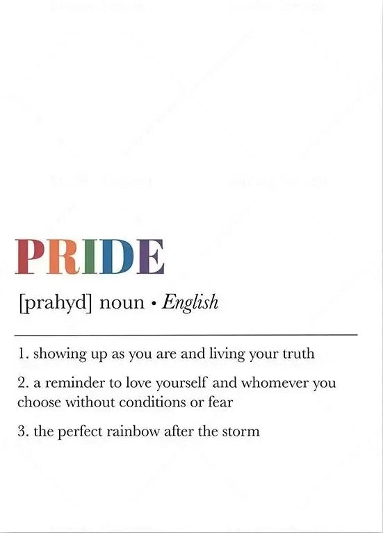 Le mot “PRIDE” apparaît en grandes lettres arc-en-ciel, immédiatement visible. La définition en dessous, en noir sur fond blanc, offre un contraste net et élégant. Le style graphique est minimaliste, lisible, percutant — il attire le regard tout en restant sobre. L’affiche s’installe facilement dans un mur, un bureau, un salon ou un espace commun, pour porter haut les couleurs de l’unité.