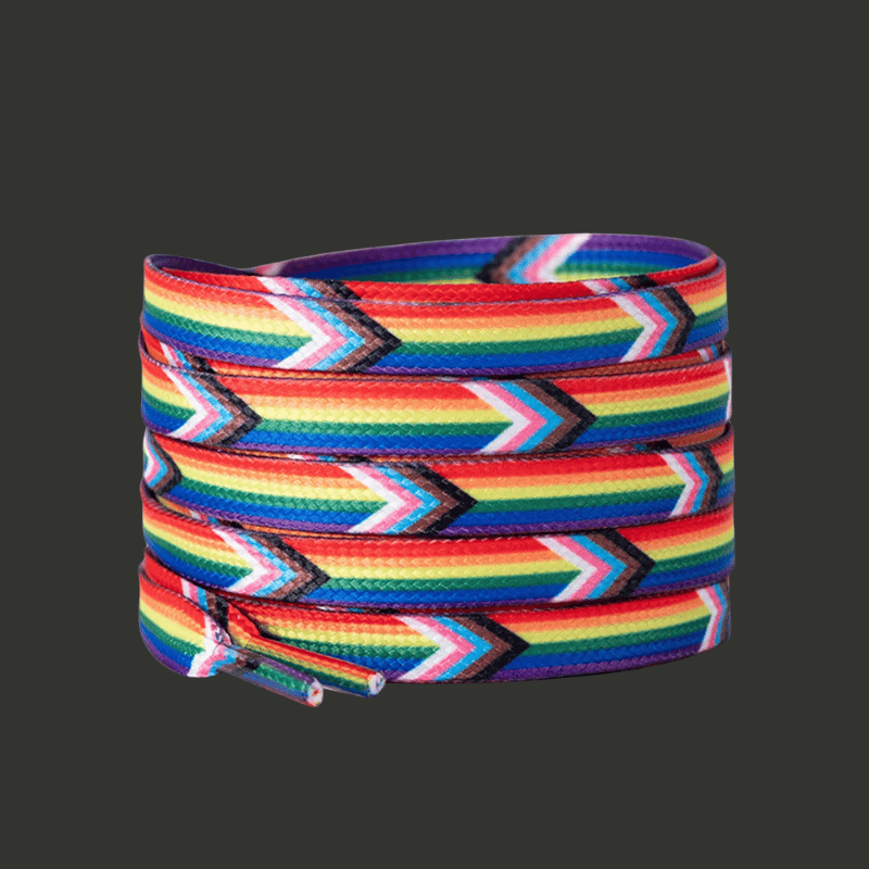 Plats, colorés, immédiatement reconnaissables, ces lacets reprennent les bandes du drapeau Pride dans des versions franches ou graphiques. Certains modèles jouent avec des chevrons dynamiques qui donnent l’impression que le mouvement ne s’arrête jamais. Le rendu est joyeux, assumé, presque joueur. Un détail qui attire l’œil et casse la routine sans jamais se prendre trop au sérieux.