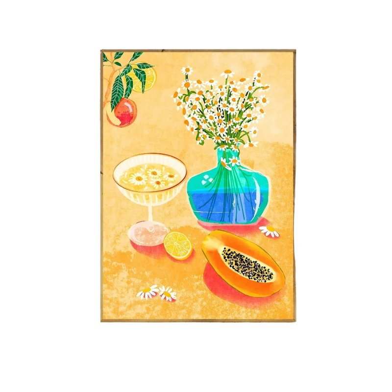 Motifs visibles : papaye ouverte, fleurs blanches, verre, vase