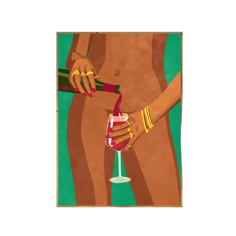 L’illustration montre un corps nu féminin, debout, versant du vin dans un verre tenu à hauteur du bassin. Ce geste fort et calme suggère un moment connecté au corps, au plaisir et à l’instant présent, sans regard extérieur.
