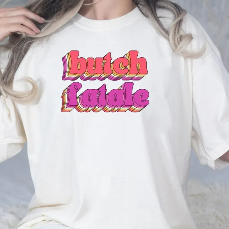 Le message “butch fatale” détourne avec humour les codes classiques : il joue avec l'idée de force, de présence et de charme butch, sans caricature. Porté au quotidien, il devient un clin d’œil complice à celles qui comprennent ses nuances et son héritage.