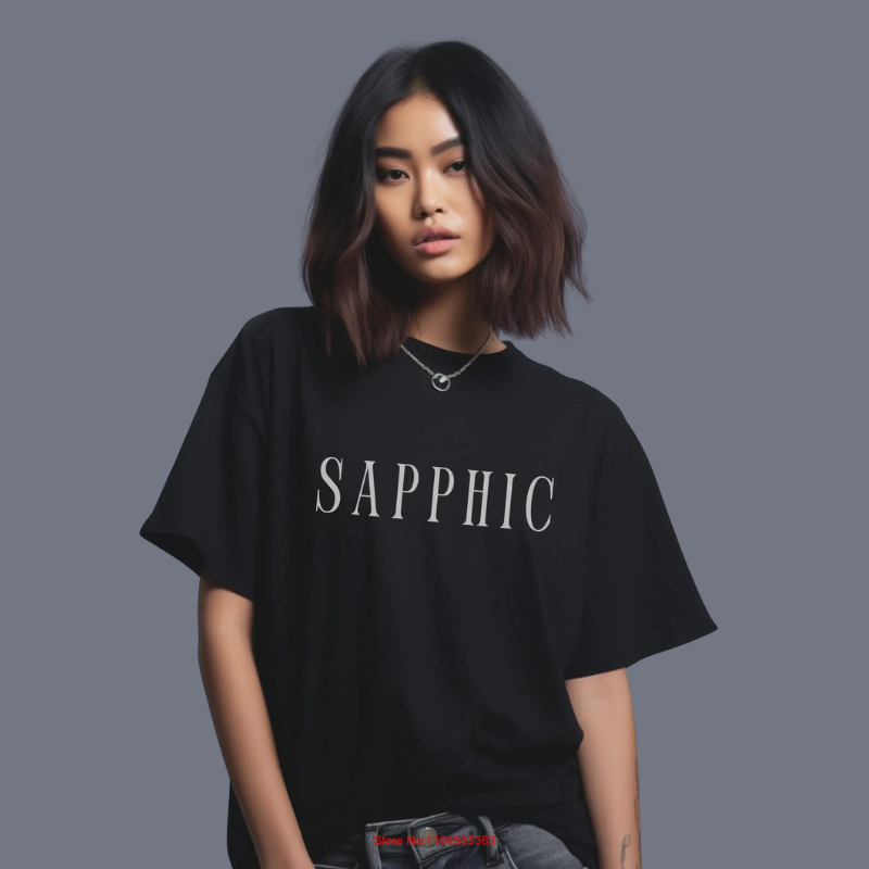 Le t-shirt noir met en valeur l’inscription “SAPPHIC”, imprimée en lettres fines et verticales. Le contraste crée un impact visuel immédiat : simple, élégant, mais impossible à ignorer.