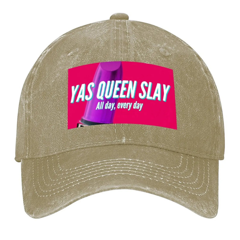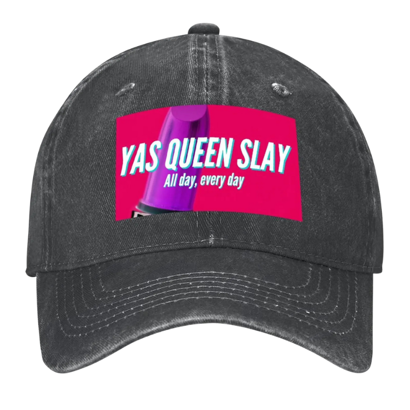 Le rectangle rose intense attire l’œil, le lettrage blanc « YAS QUEEN SLAY » s’affiche clairement, accompagné d’un visuel de rouge à lèvres violet créant une signature visuelle forte. La casquette existe en plusieurs couleurs de tissu, toutes avec un effet légèrement usé, donnant un style expressif, parfait pour la scène comme pour la rue. C’est un accessoire pensé pour celles et ceux qui aiment jouer, exagérer, amplifier — bref, vivre en couleur.
