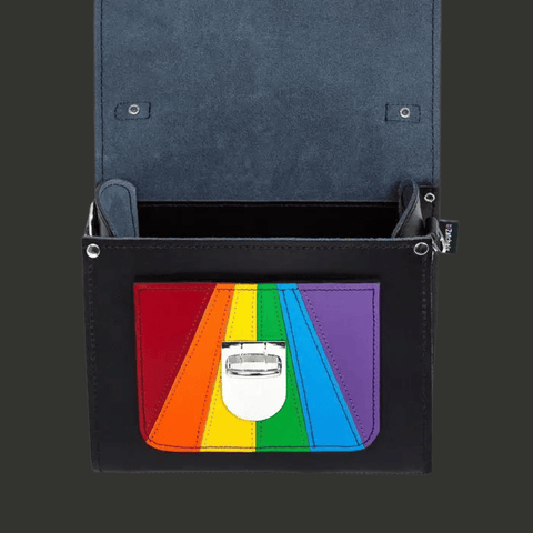 Le drapeau arc-en-ciel, cousu sur la face avant, agit comme un symbole immédiatement lisible. Il évoque la diversité, le soutien et la célébration de la communauté LGBT+. Associé au cuir noir, il crée un contraste net, équilibré, où la symbolique communautaire dialogue avec une esthétique contemporaine et une fabrication artisanale assumée.