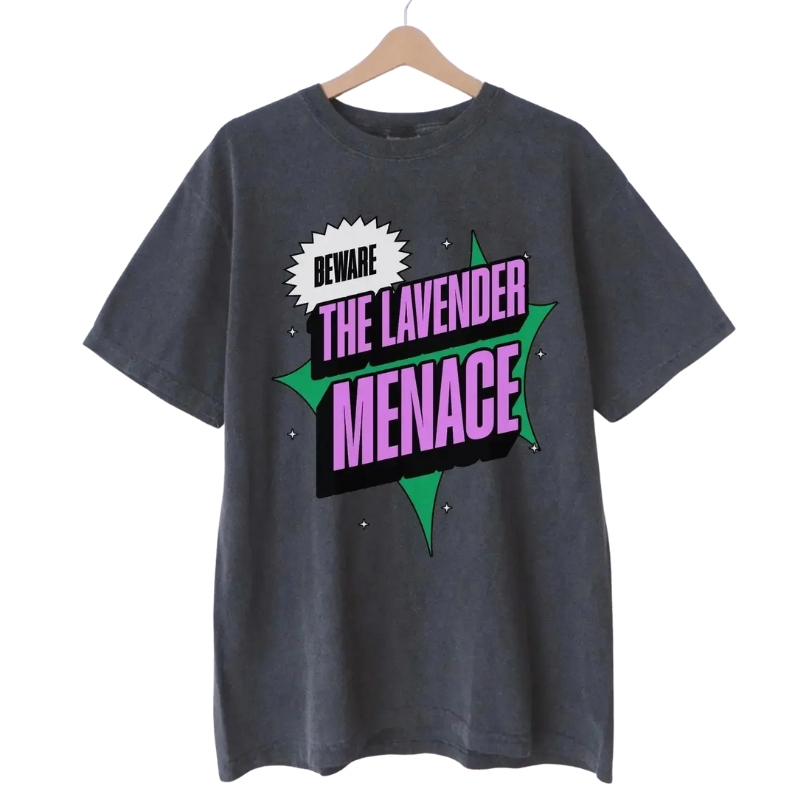 Motif : texte « BEWARE THE LAVENDER MENACE » au centre du t-shirt