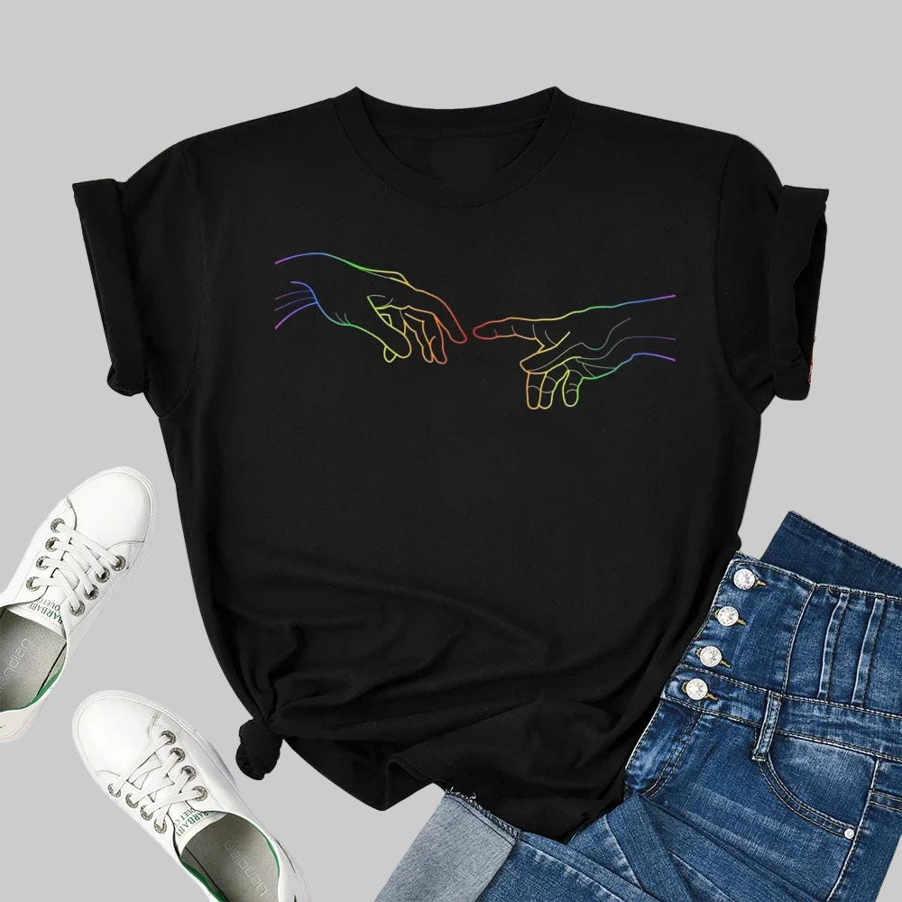 L’illustration reprend la composition iconique du plafond de la chapelle Sixtine, mais en la transformant grâce à un line art multicolore, inspiré des couleurs de la fierté. Les contours stylisés rendent hommage à l’œuvre d’origine tout en la réinventant dans une esthétique queer moderne. Ici, les mains ne transmettent pas une puissance verticale, mais une connexion horizontale, inclusive, ouverte à chaque identité. En adoptant ce motif, vous portez un fragment d’histoire artistique réapproprié par la communauté.